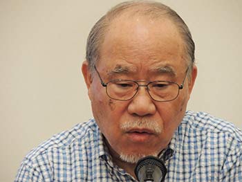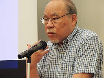 | 会員スピーチは山川浩一郎相談役(^O^) 講師の永田県相談役とは40年以上のお付き合い! 盟友のスピーチに永田県相談役もこの笑顔!(*^▽^*) |